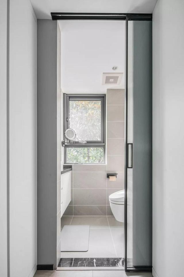 白色的橱柜靠在温暖的灰色墙壁和地板砖上 ,使其更加干净利落。 百叶窗产生的光影是一种无声的环境语言,对人们起着安静的作用。